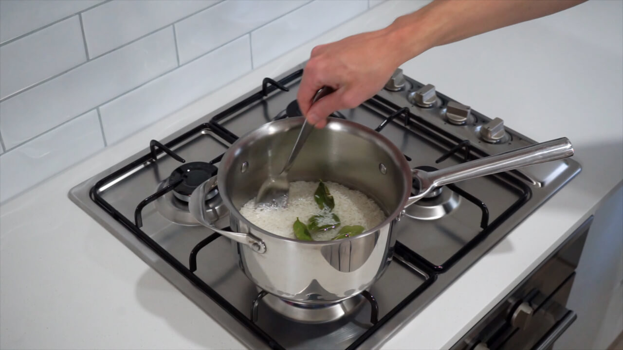 For the rice, place 300 grams of jasmine rice in a pot with 500 milliliters of cold water and 4 kaffir lime leaves. Stir to break up any clumps and bring to a boil. Once boiling, put the lid on, reduce heat to low, and let it cook for 12 minutes.