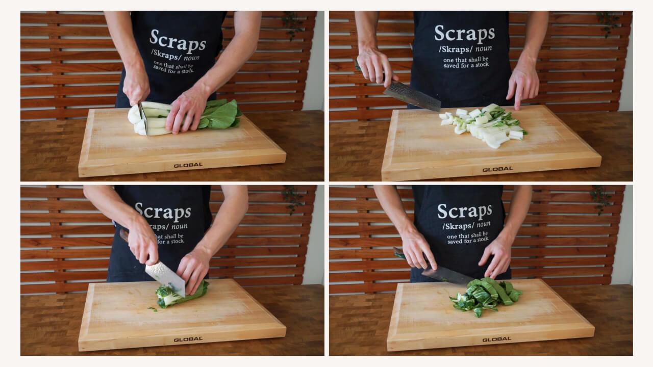 For the side dish, wash 2 bok choy and separate the stems from the leaves. Slice the stems into even-sized pieces and shred the leaves.